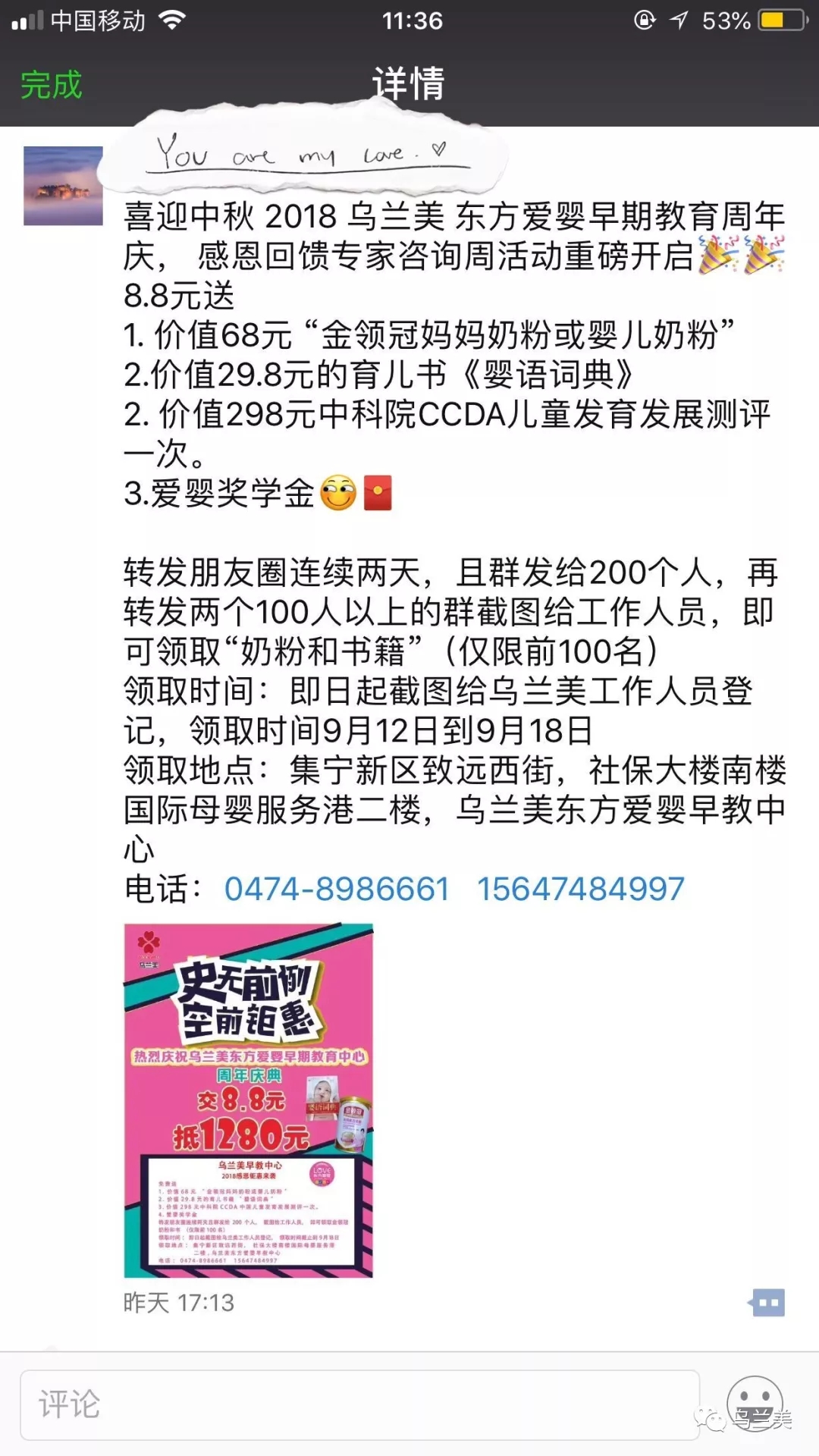 領(lǐng)取時(shí)間:即日起截圖給烏蘭美•東方愛嬰早教中心工作人員登記,領(lǐng)取時(shí)間截止到2018年9月19日。